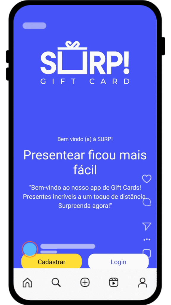 Encontre o Surp no Google Play ou App Store e instale em poucos segundos e faça seu cadastro de forma simples e segura.